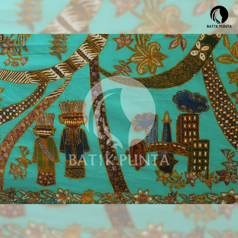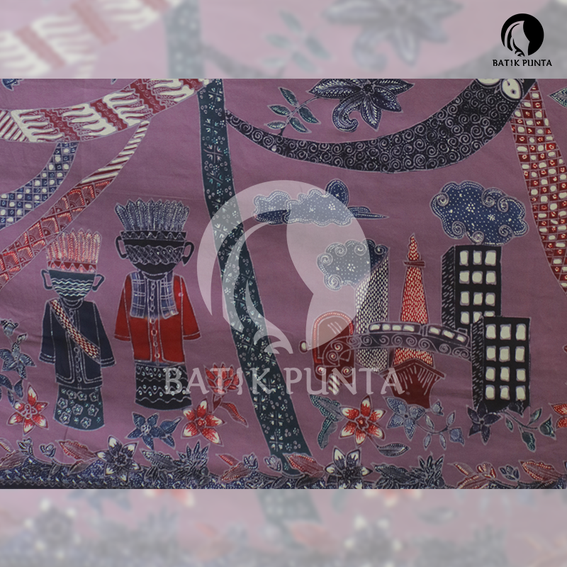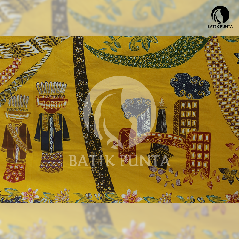 Motif Serba Serbi Jakarta menampilkan gambar ondel-ondel Betawi, Tanjidor, rumah Betawi, dan Gedung-gedung bertingkat di Jakarta. Batik dilengkapi dengan Tumpal sebagai ciri khas Batik Betawi. Menggunakan kain katun primis sima berukuran 245 cm x 115 cm. Penampakan kain halus dan dingin. Tersedia warna salem, ungu, kuning, dan hijau toska.